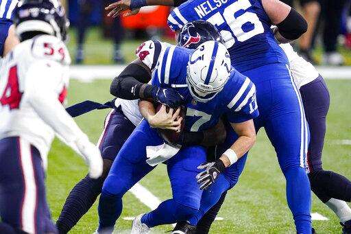 Houston Texans defensive end Charles Omenihu (94) sacks Indianapolis Colts quarterback Philip Rivers (17) in the first half of an NFL football game in Indianapolis, Sunday, Dec. 20, 2020. (AP Photo/Darron Cummings) The Associated Press