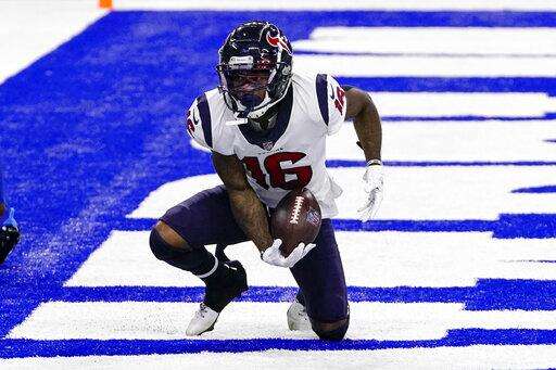 Houston Texans wide receiver Keke Coutee (16) scores a touchdown against the Indianapolis Colts in the second half of an NFL football game in Indianapolis, Sunday, Dec. 20, 2020. (AP Photo/AJ Mast) The Associated Press