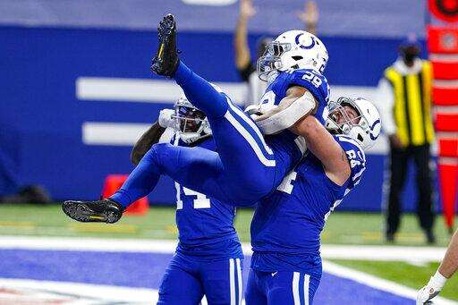 Indianapolis Colts running back Jonathan Taylor (28) celebrates touchdown with offensive guard Mark Glowinski (64) against the Houston Texans in the first half of an NFL football game in Indianapolis, Sunday, Dec. 20, 2020. (AP Photo/Darron Cummings) The Associated Press