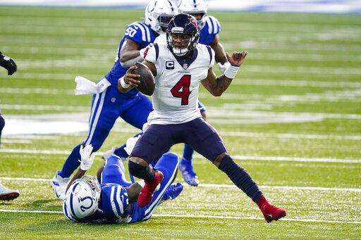 Houston Texans quarterback Deshaun Watson (4) runs against the Indianapolis Colts in the second half of an NFL football game in Indianapolis, Sunday, Dec. 20, 2020. (AP Photo/Darron Cummings) The Associated Press