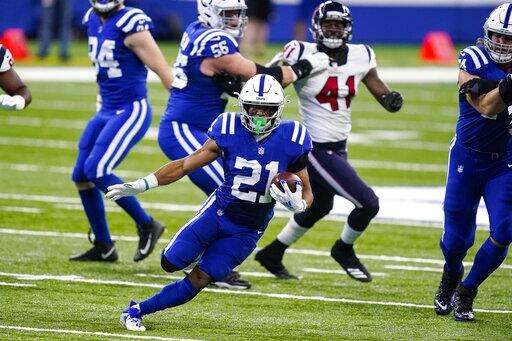 Indianapolis Colts running back Nyheim Hines (21) runs against the Houston Texans in the first half of an NFL football game in Indianapolis, Sunday, Dec. 20, 2020. (AP Photo/Darron Cummings) The Associated Press