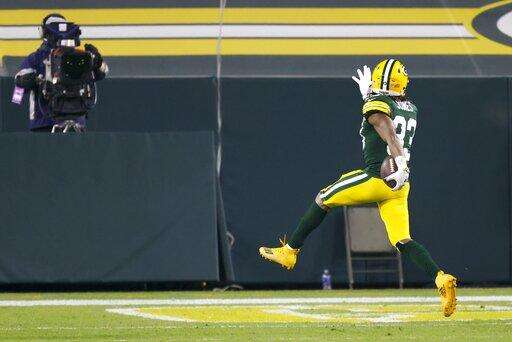 Green Bay's Davante Adams had seven catches for 42 yards and didn't reach the end zone, ending his streak of eight games with a touchdown reception.