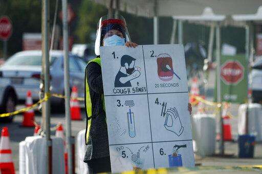FILE - In this Jan. 5, 2021, file photo, a worker gives instructions to motorists at a COVID-19 testing site in Los Angeles. The U.S. registered its highest deaths yet from the coronavirus on the same day as a mob attack on the nation's capitol laid bare some of the same, deep political divisions that have hampered the battle against the pandemic. (AP Photo/Marcio Jose Sanchez, File) The Associated Press