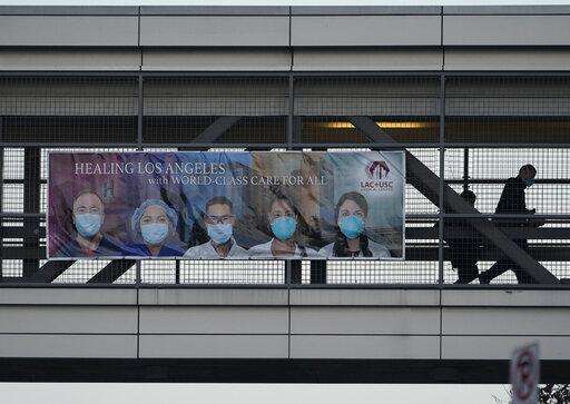 FILE - In this Jan. 5, 2021, file photo, medical personnel walk on a bridge to a hospital parking lot after their work shift at LAC+ USC Medical Center in Los Angeles. The U.S. registered its highest deaths yet from the coronavirus on the same day as a mob attack on the nation's capitol laid bare some of the same, deep political divisions that have hampered the battle against the pandemic. (AP Photo/Damian Dovarganes, File) The Associated Press