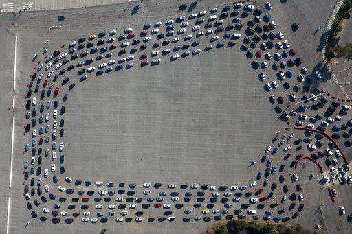 FILE - In this Jan. 4, 2021, file photo, motorists line up to take a coronavirus test in a parking lot at Dodger Stadium in Los Angeles. The U.S. registered its highest deaths yet from the coronavirus on the same day as a mob attack on the nation's capitol laid bare some of the same, deep political divisions that have hampered the battle against the pandemic. (AP Photo/Ringo H.W. Chiu) The Associated Press