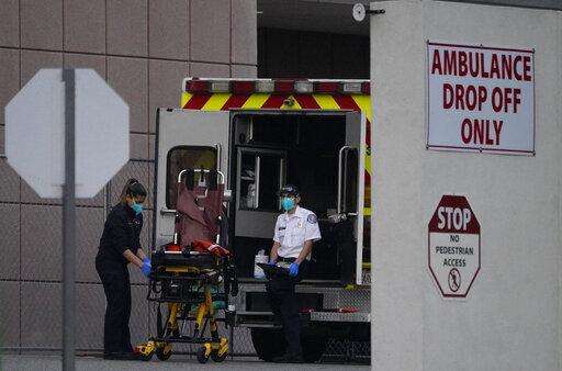 FILE - In this Jan. 5, 2021, file photo, emergency medical technicians sanitize an ambulance stretcher after transporting a patient at Los Angeles County + USC Medical Center in Los Angeles. The U.S. registered its highest deaths yet from the coronavirus on the same day as a mob attack on the nation's capitol laid bare some of the same, deep political divisions that have hampered the battle against the pandemic. (AP Photo/Damian Dovarganes, File) The Associated Press