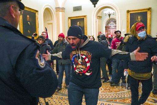 FILE - In this Jan. 6, 2021, file photo, Trump supporters gesture to U.S. Capitol Police in the hallway outside of the Senate chamber at the Capitol in Washington. The U.S. registered its highest deaths yet from the coronavirus on the same day as a mob attack on the nation's capitol laid bare some of the same, deep political divisions that have hampered the battle against the pandemic. (AP Photo/Manuel Balce Ceneta, File) The Associated Press