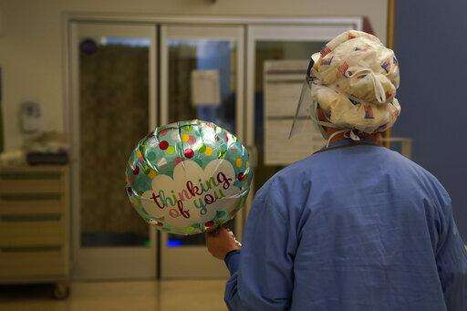 Registered nurse Anita Grohmann carries a balloon delivered to a patient in a COVID-19 unit at St. Joseph Hospital in Orange, Calif. Thursday, Jan. 7, 2021. The state's hospitals are trying to prepare for the possibility that they may have to ration care for lack of staff and beds - and hoping they don't have to make that choice as many hospitals strain under unprecedented caseloads. (AP Photo/Jae C. Hong) The Associated Press
