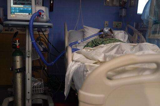 A COVID-19 patient, placed on a ventilator, rests at St. Joseph Hospital in Orange, Calif. Thursday, Jan. 7, 2021. California health authorities reported Thursday a record two-day total of 1,042 coronavirus deaths as many hospitals strain under unprecedented caseloads. (AP Photo/Jae C. Hong) The Associated Press
