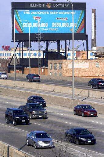 A digital lottery billboard on the Kennedy Expressway in Chicago, Tuesday, Jan. 12, 2021, shows the recent jackpot for the Mega Millions game. Lottery players have a chance to win the largest jackpots in nearly two years as Tuesday's Mega Millions has grown to an estimated $625 million and Wednesday's Powerball to an estimated $550 million. (AP Photo/Charles Rex Arbogast)