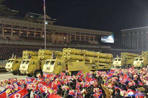 This photo provided by the North Korean government shows a military parade marking the ruling party congress, at Kim Il Sung Square in Pyongyang, North Korea Thursday, Jan. 14, 2021. North Korea rolled out developmental ballistic missiles designed to be launched from submarines and other military hardware in a parade that punctuated leader Kim Jong Un's defiant calls to expand his nuclear weapons program. Independent journalists were not given access to cover the event depicted in this image distributed by the North Korean government. The content of this image is as provided and cannot be independently verified. Korean language watermark on image as provided by source reads: "KCNA" which is the abbreviation for Korean Central News Agency. (Korean Central News Agency/Korea News Service via AP)