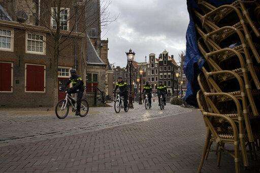 FILE - In this Jan. 14, 2021, file photo, police officers on bicycles pass stacked up terrace chairs outside a bar in the near-empty Red Light District in Amsterdam. The Dutch government this week extended by three weeks the tough lockdown in force since mid-December amid fears that coronavirus infection rates are not declining quickly enough and fears about a new more transmissible variant of the COVID-19 virus. (AP Photo/Peter Dejong) The Associated Press