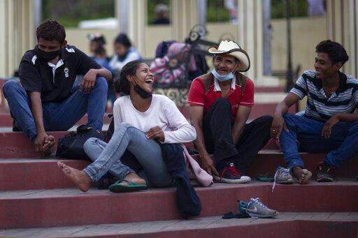 Migrants hoping to reach the distant U.S. border rest on the side of a highway, in Jocotan, Guatemala, Saturday, Jan. 16, 2021. Honduran migrants pushed their way into Guatemala Friday night without registering, a portion of a larger migrant caravan that had left the Honduran city of San Pedro Sula before dawn, Guatemalan authorities said. (AP Photo/Sandra Sebastian)