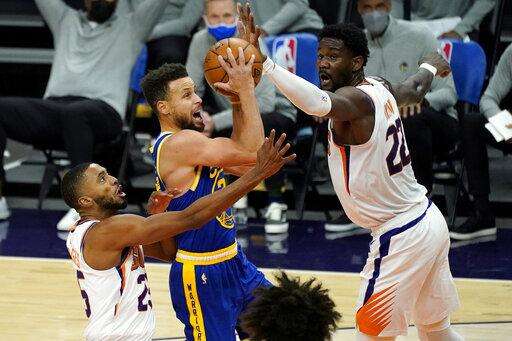 Golden State Warriors guard Stephen Curry, center, drives between Phoenix Suns center Deandre Ayton, right, and forward Mikal Bridges during the first half of an NBA basketball game Thursday, Jan. 28, 2021, in Phoenix. (AP Photo/Matt York) The Associated Press