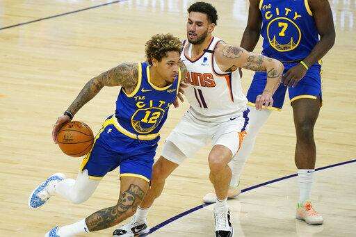 Golden State Warriors guard Kelly Oubre Jr. (12) drives past Phoenix Suns forward Abdel Nader (11) during the first half of an NBA basketball game, Thursday, Jan. 28, 2021, in Phoenix. (AP Photo/Matt York) The Associated Press
