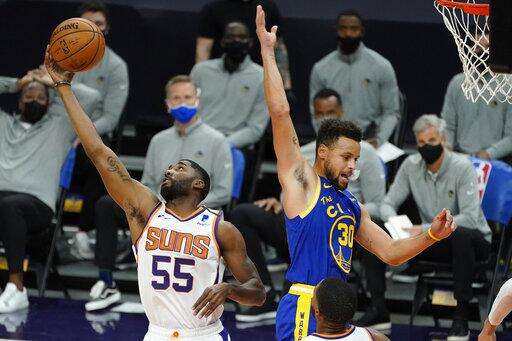 Phoenix Suns guard E'Twaun Moore (55) grabs a rebound next to Golden State Warriors guard Stephen Curry (30) during the first half of an NBA basketball game Thursday, Jan. 28, 2021, in Phoenix. (AP Photo/Matt York) The Associated Press