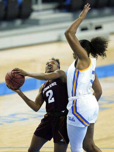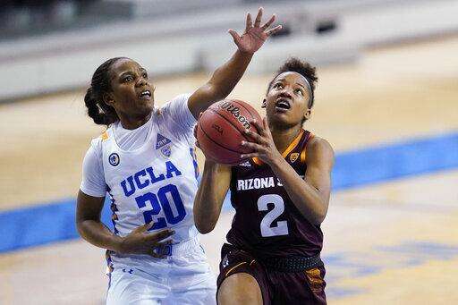 Arizona State guard Jaddan Simmons (2) looks to shoot against UCLA forward Lauryn Miller, right, during the first quarter of an NCAA college basketball game Friday, Jan. 29, 2021, in Los Angeles. (AP Photo/Ashley Landis) The Associated Press