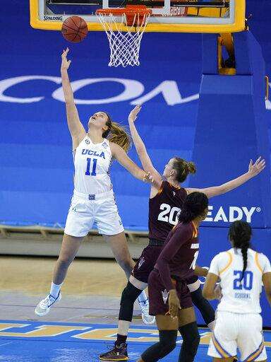 UCLA forward Emily Bessoir (11) shoots next to Arizona State forward Katelyn Levings (20) during the second quarter of an NCAA college basketball game Friday, Jan. 29, 2021, in Los Angeles. (AP Photo/Ashley Landis) The Associated Press