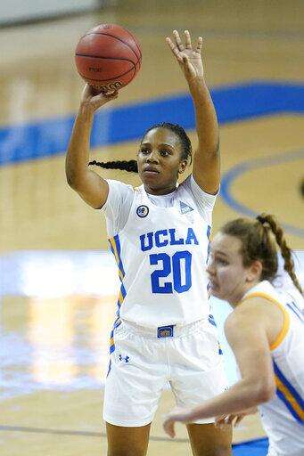 UCLA guard Charisma Osborne (20) shoots a 3-pointer during the fourth quarter of the team's NCAA college basketball game against Arizona State on Friday, Jan. 29, 2021, in Los Angeles. (AP Photo/Ashley Landis) The Associated Press