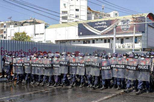 YANGON, Myanmar (AP) - Police cracked down on demonstrators opposing Myanmar's military coup, firing warning shots and shooting water cannons to disperse crowds that took to the streets again Tuesday in defiance of new protest bans.