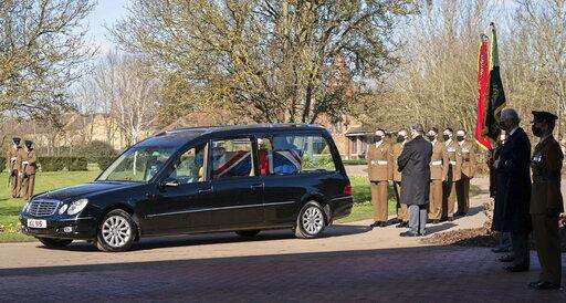 The funeral cortege of Captain Tom Moore arrives at Bedford Crematorium, in Bedford, England, Saturday, Feb. 27, 2021. Tom Moore, the 100-year-old World War II veteran who captivated the British public in the early days of the coronavirus pandemic with his fundraising efforts died, Tuesday Feb. 2, 2021. (Joe Giddens/Pool Photo via AP)
