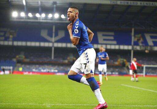 Everton's Richarlison celebrates after scoring his side's opening goal during the English Premier League soccer match between Everton and Southampton at Goodison Park in Liverpool, England, Monday, March 1, 2021. (Peter Byrne/Pool via AP) The Associated Press