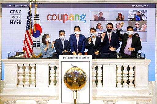 In this photo provided by the New York Stock Exchange, Coupang Founder and CEO Bom Kim, third left, and his colleagues, joined by John Tuttle, NYSE Vice Chairman, second from right, rings the NYSE opening before his company's IPO, Thursday March 11, 2021.The biggest IPO in years is rolling out Thursday on the NYSE where Coupang, the South Korean equivalent of Amazon in the U.S., or Alibaba in China, will begin trading under the ticker "CPNG." (Courtney Crow/New York Stock Exchange via AP) The Associated Press