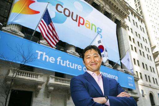 In this photo provided by the New York Stock Exchange, Coupang Founder and CEO Bom Kim poses in front of the New York Stock Exchange facade before his company's IPO, Thursday march 11, 2021.The biggest IPO in years is rolling out Thursday on the NYSE where Coupang, the South Korean equivalent of Amazon in the U.S., or Alibaba in China, will begin trading under the ticker "CPNG." (Courtney Crow/New York Stock Exchange via AP) The Associated Press