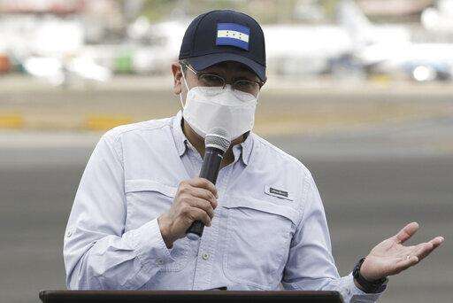 Honduran President Juan Orlando Hernandez during a ceremony at an air base to receive a shipment of the AstraZeneca COVID-19 vaccine via the COVAX program, in Tegucigalpa, Honduras, Saturday, March 13, 2021. (AP Photo/Elmer Martinez) The Associated Press