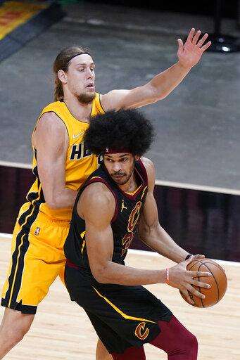 Cleveland Cavaliers center Jarrett Allen, foreground, looks for an opening past Miami Heat forward Kelly Olynyk during the first half of an NBA basketball game Tuesday, March 16, 2021, in Miami. (AP Photo/Wilfredo Lee) The Associated Press
