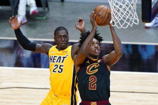 Cleveland Cavaliers guard Collin Sexton (2) shoots next to Miami Heat guard Kendrick Nunn (25) during the first half of an NBA basketball game Tuesday, March 16, 2021, in Miami. (AP Photo/Wilfredo Lee) The Associated Press