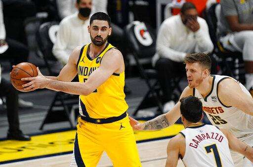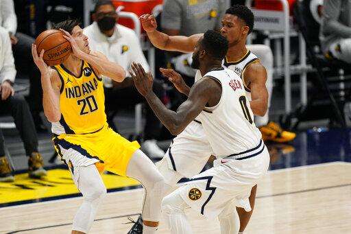 Indiana Pacers center Goga Bitadze, left, looks to pass the ball as Denver Nuggets guard Facundo Campazzo, front right, and center Isaiah Hartenstein defend in the first half of an NBA basketball game Monday, March 15, 2021, in Denver. (AP Photo/David Zalubowski) The Associated Press