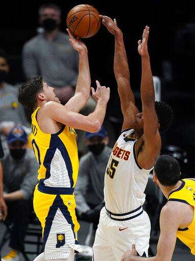 Indiana Pacers forward Doug McDermott, left, shoots over Denver Nuggets forward JaMychal Green, front right, and guard PJ Dozier in the first half of an NBA basketball game Monday, March 15, 2021, in Denver. (AP Photo/David Zalubowski) The Associated Press