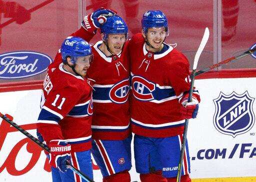 Montreal Canadiens' Brendan Gallagher, left, and Jesperi Kotkaniemi, right, congratulate Corey Perry after his goal against the Vancouver Canucks during the first period of an NHL hockey game Friday, March 19, 2021, in Montreal. (Paul Chiasson/The Canadian Press via AP) The Associated Press