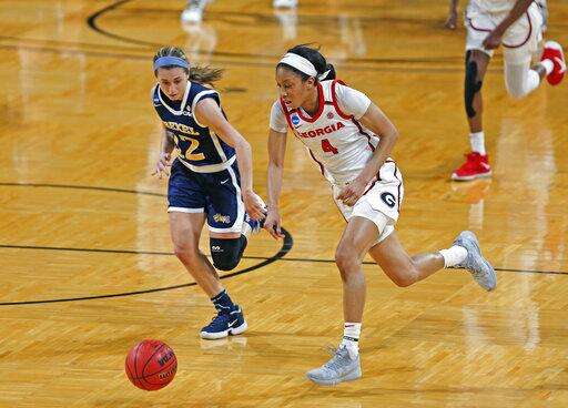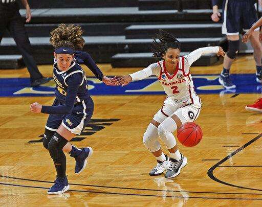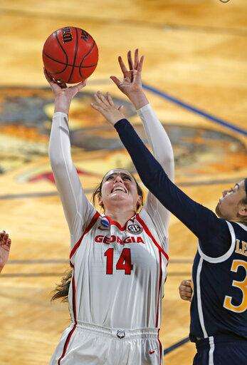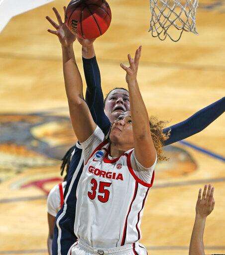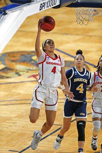 Georgia guard Mikayla Coombs (4) scores during the second half of a college basketball game in the first round of the women's NCAA tournament at the Greehey Arena in San Antonio, Texas, Monday, March 22, 2021. (AP Photo/Ronald Cortes) The Associated Press