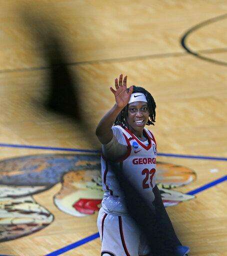 Georgia guard Que Morrison (23) waves to fans at the end of the game of a college basketball game in the first round of the women's NCAA tournament at the Greehey Arena in San Antonio, Texas, Monday, March 22, 2021. (AP Photo/Ronald Cortes) The Associated Press