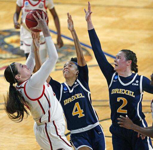 Georgia center Jenna Staiti (14) shoots over Drexel guard Kayla Bacon (4) and Drexel forward Hetta Saatman (2) during the second half of a college basketball game in the first round of the women's NCAA tournament at the Greehey Arena in San Antonio, Texas, Monday, March 22, 2021. (AP Photo/Ronald Cortes) The Associated Press