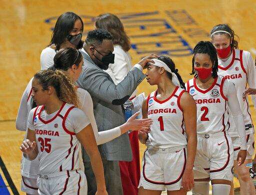 Georgia guard Chloe Chapman (1) receives congratulation from assistant head coach Robert Mosley at the end of the game of a college basketball game in the first round of the women's NCAA tournament at the Greehey Arena in San Antonio, Texas, Monday, March 22, 2021. (AP Photo/Ronald Cortes) The Associated Press