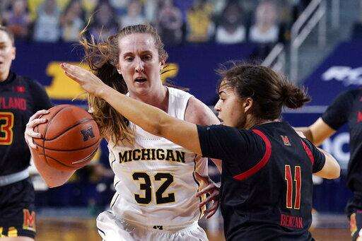 Michigan guard Leigha Brown (32) drives on Maryland guard Katie Benzan (11) during the first half of an NCAA college basketball game, Thursday, March 4, 2021, in Ann Arbor, Mich. (AP Photo/Carlos Osorio) The Associated Press