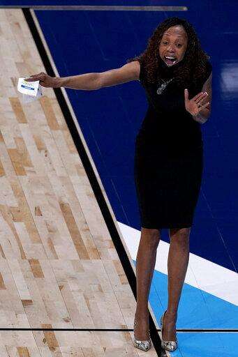 Kentucky head coach Kyra Elzy taks to her players during the first half of a college basketball game against Idaho State in the first round of the women's NCAA tournament at the Alamodome in San Antonio, Sunday, March 21, 2021. (AP Photo/Charlie Riedel) The Associated Press