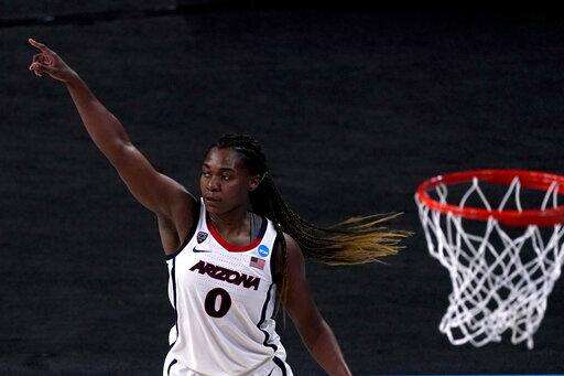 Arizona forward Trinity Baptiste celebrates after making a 3-point shot during the second half of a college basketball game against Stony Brook in the first round of the women's NCAA tournament at the Alamodome in San Antonio, Monday, March 22, 2021. (AP Photo/Charlie Riedel) The Associated Press