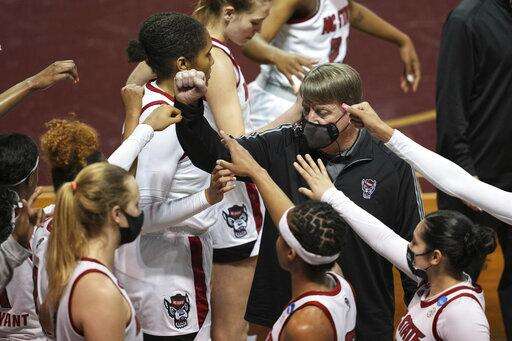 North Carolina State head coach Wes Moore, right, bumps fists with players after a timeout during the second half of a college basketball game against North Carolina A&T in the first round of the women's NCAA basketball tournament at the University Events Center in San Marcos, Texas, Sunday, March 21, 2021. (AP Photo/Chuck Burton) The Associated Press