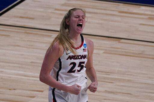 Arizona forward Cate Reese celebrates after making a shot during the first half of a college basketball game against Stony Brook in the first round of the women's NCAA tournament at the Alamodome in San Antonio, Monday, March 22, 2021. (AP Photo/Charlie Riedel) The Associated Press