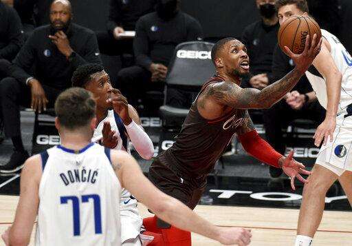 Portland Trail Blazers guard Damian Lillard, right, drives to the basket on Dallas Mavericks guard Luka Doncic, left, during the second half of an NBA basketball game in Portland, Ore., Sunday, March 21, 2021. (AP Photo/Steve Dykes) The Associated Press
