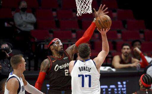 Portland Trail Blazers forward Robert Covington, center, fights through a screen set by Dallas Mavericks center Dwight Powell, right, to get to guard Luka Doncic, left, during the first half of an NBA basketball game in Portland, Ore., Sunday, March 21, 2021. AP Photo/Steve Dykes) The Associated Press