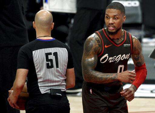 Portland Trail Blazers guard Damian Lillard, right, speaks with referee Aaron Smith during the second half of an NBA basketball game against the Dallas Mavericks in Portland, Ore., Sunday, March 21, 2021. ( AP Photo/Steve Dykes) The Associated Press