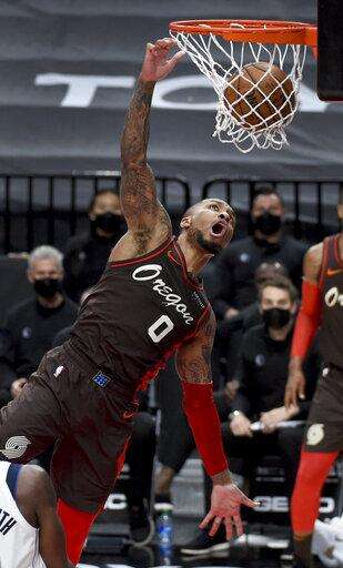 Portland Trail Blazers guard Damian Lillard dunks the ball against the Dallas Mavericks during the second half of an NBA basketball game in Portland, Ore., Sunday, March 21, 2021. ( AP Photo/Steve Dykes) The Associated Press