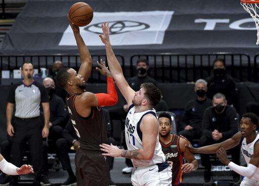 Dallas Mavericks guard Luka Doncic (77) shoots the ball over Portland Trail Blazers forward Robert Covington during the second half of an NBA basketball game in Portland, Ore., Sunday, March 21, 2021. (AP Photo/Steve Dykes) The Associated Press