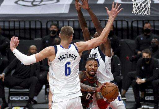 Portland Trail Blazers guard Damian Lillard, middle, passes the ball on Dallas Mavericks center Kristaps Porzingis, left, during the second half of an NBA basketball game in Portland, Ore., Sunday, March 21, 2021. (AP Photo/Steve Dykes) The Associated Press