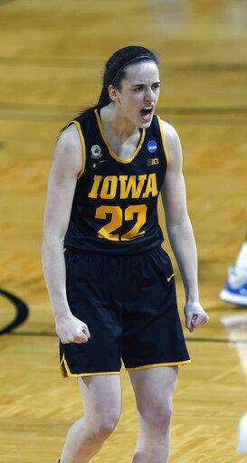 Iowa guard Caitlin Clark (22) react after hitting a three during the first half of a college basketball game in the second round of the women's NCAA tournament at the Greehey Arena in San Antonio, Tuesday, March 23, 2021. (AP Photo/Ronald Cortes) The Associated Press